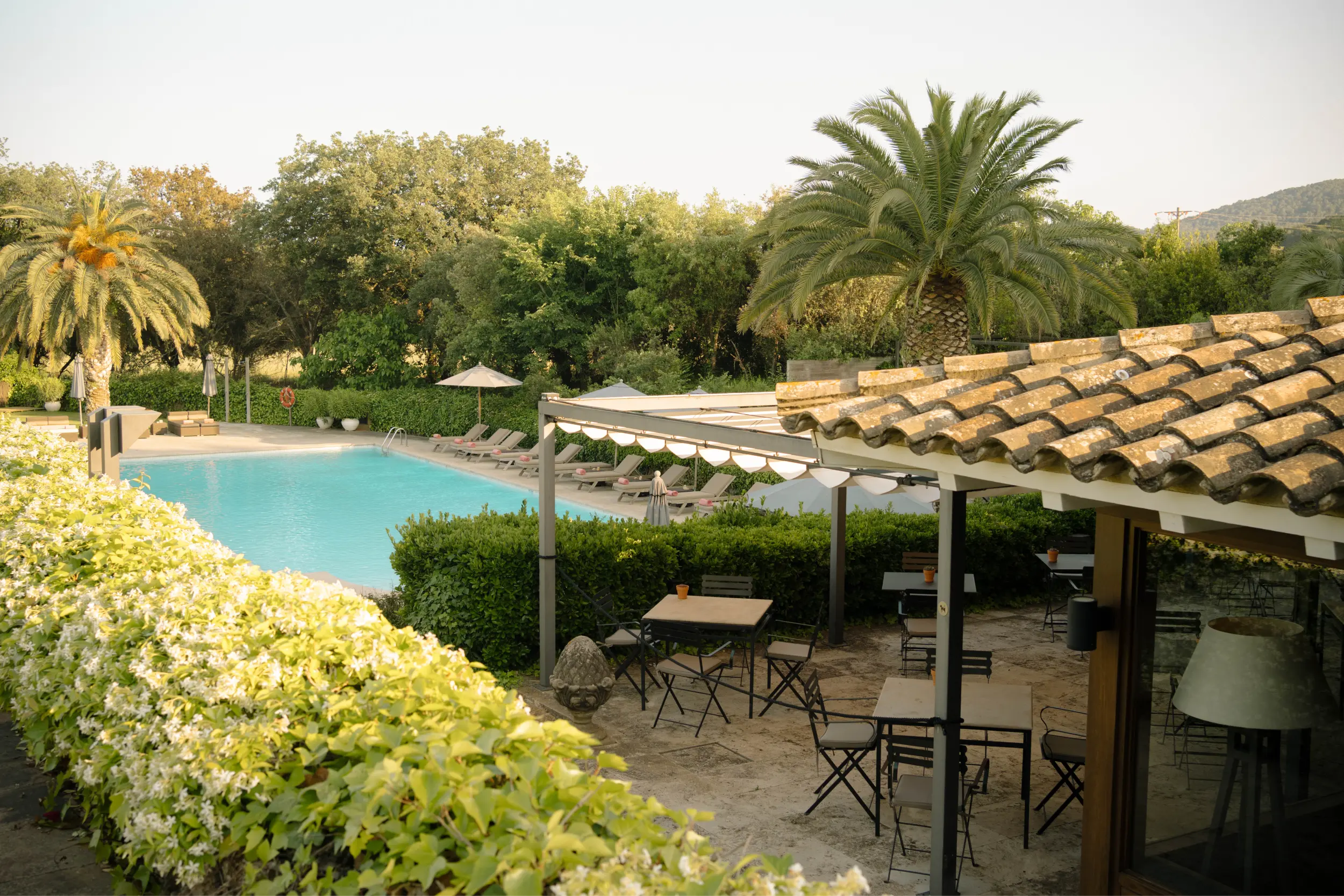 Am Pool, ein entspanntes Ambiente im mediterranen Stil für Cocktails und gesellige Runden.