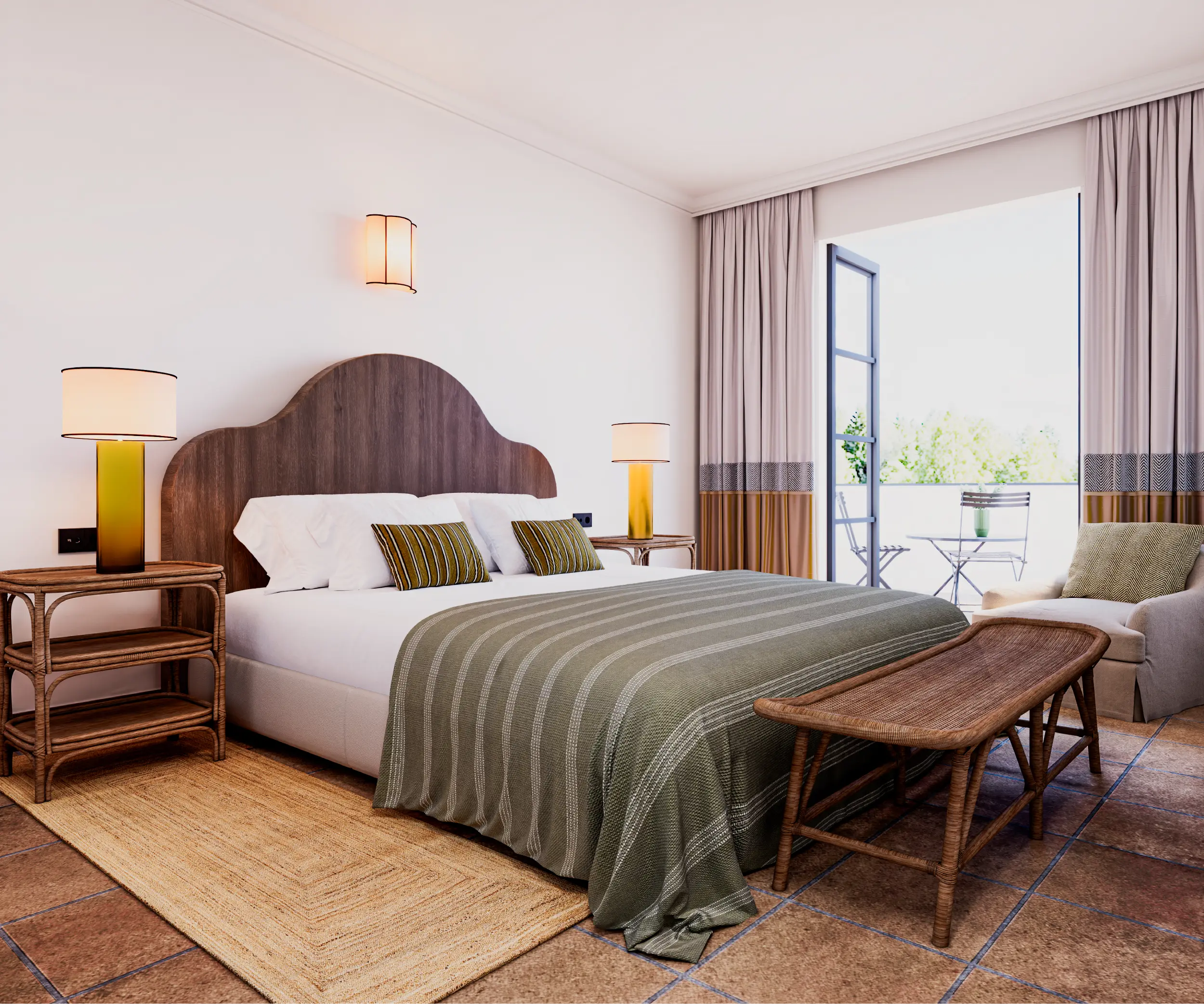 Enjoy your private terrace and take in the stunning views, creating the perfect spot to relax and unwind. Inside, these spacious rooms, ranging from 40 to 50 m², feature a cosy sitting area with a sofa and table, ideal for reading or relaxing. The spacious bathrooms with bathtubs and luxury amenities add a touch of indulgence. Perfect for two, and for little ones, we provide cots on request, combining natural light, comfort and space for a memorable stay.