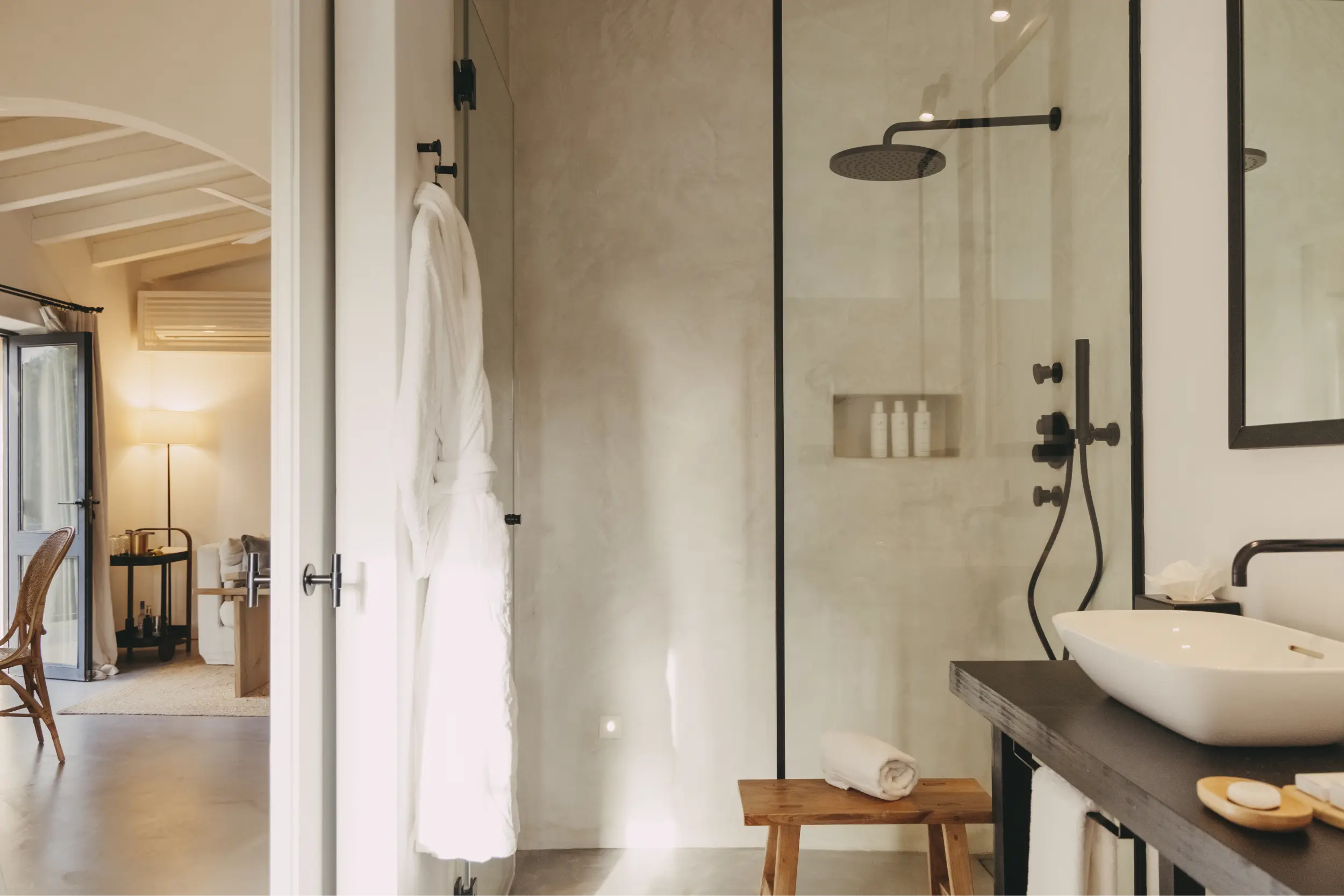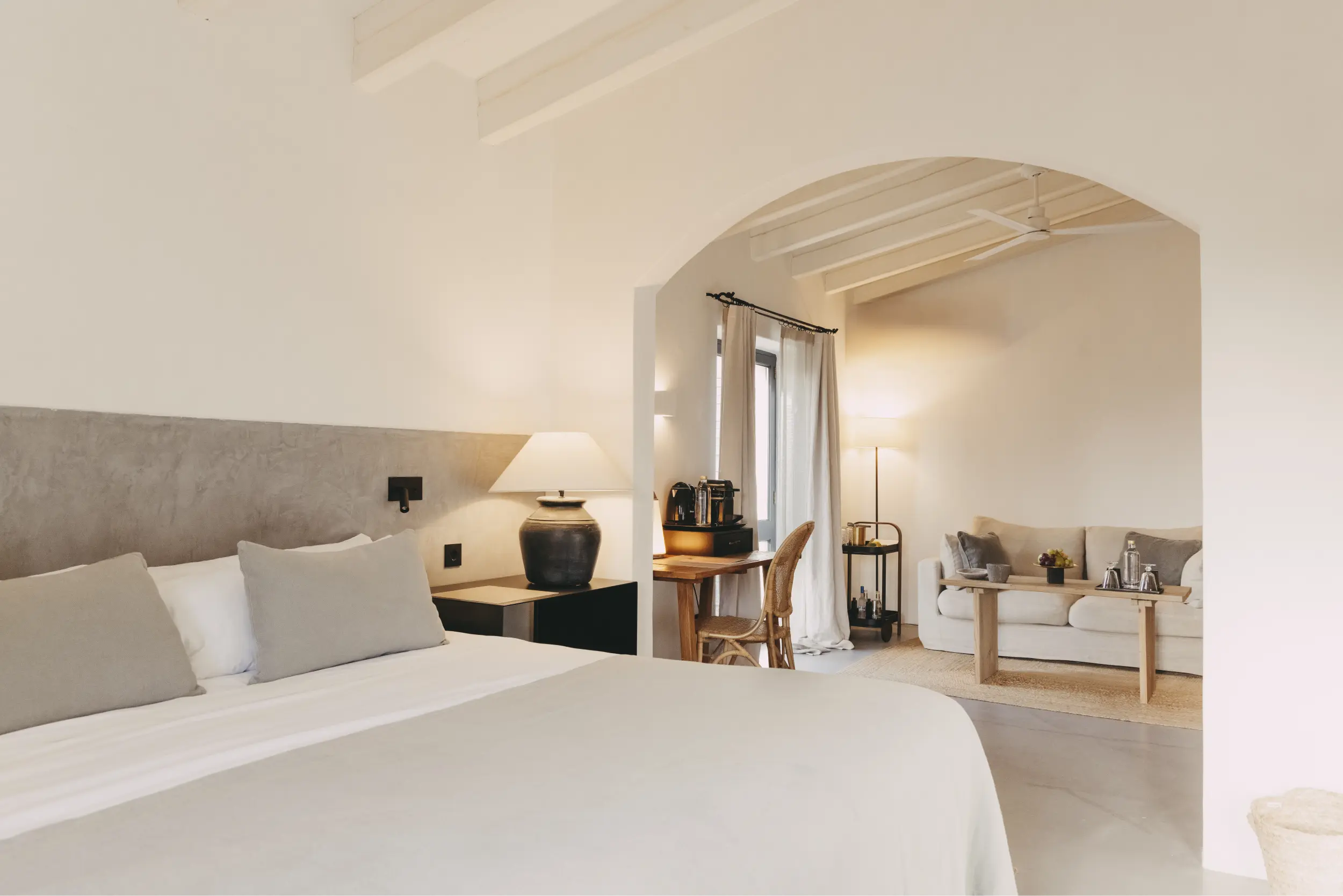 The Premium Vineyard Suite is a spacious retreat that invites tranquillity and relaxation. The lounge, featuring a cosy sofa, offers the perfect spot to unwind and lose yourself in a good book. From the private terrace or veranda, enjoy the serene views of the vineyards that produce the estate’s wine, creating a unique connection with the land. Natural light floods every corner, creating a serene atmosphere where time slows down, inviting you to enjoy a peaceful experience surrounded by beauty and nature.