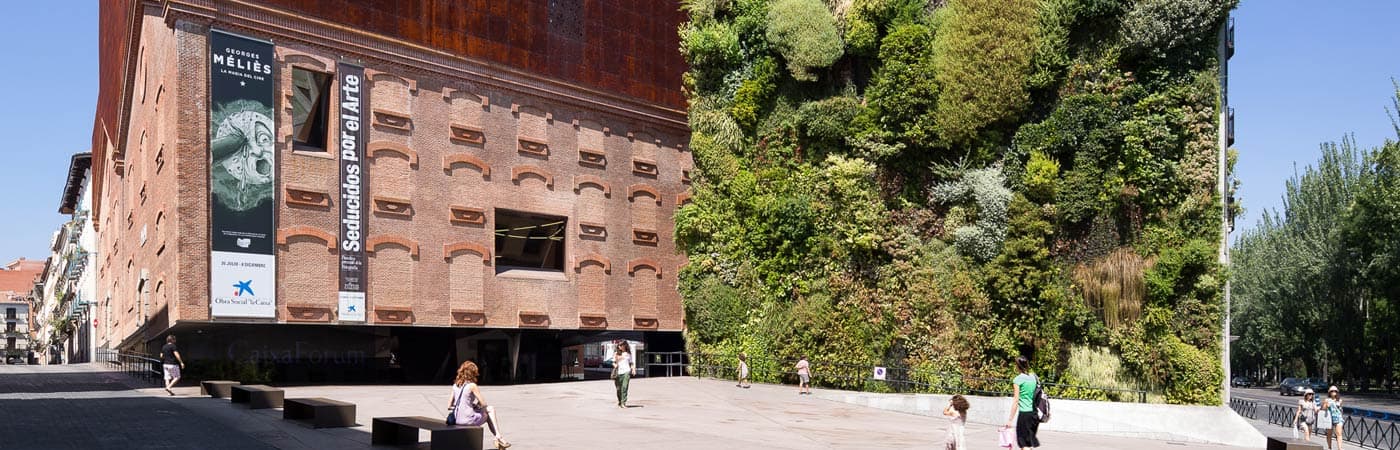 El centro cultural CaixaForum, situado frente al Museo del Prado, fue diseñado por los renombrados arquitectos suizos Herzog & De Meuron, restauración que desafía la ley de gravedad de un antiguo edificio industrial que alberga exposiciones temporales gestionadas por la Obra Social “la Caixa”, afiliado con CaixaBank, uno de los bancos más importantes de España.