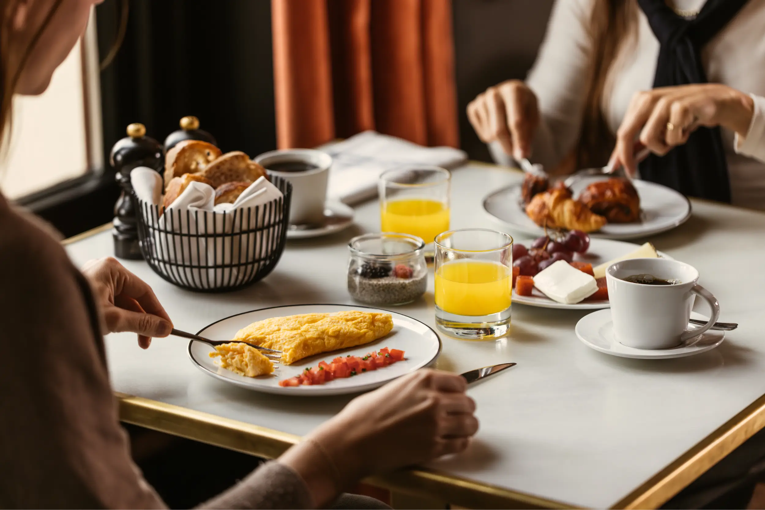 Un rincón agradable donde entran los primeros rayos del día, para disfrutarlos dentro o al aire libre. Buffet frío, platos calientes al momento y una mesa pensada para empezar Madrid con calma y las mejores vistas.
